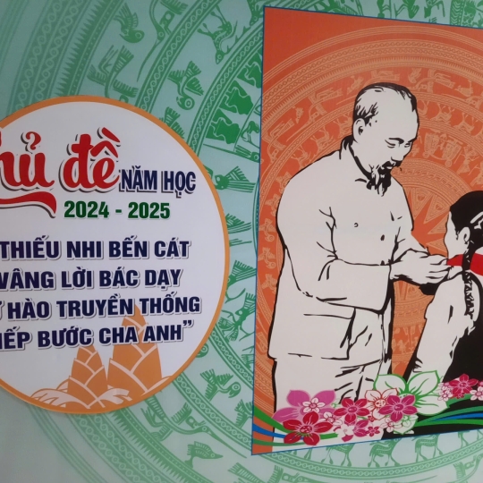 Bạn muốn truyền tải "Chủ đề năm học" một cách trực quan, sinh động và truyền cảm hứng nhất? Hãy nhìn vào mẫu Trang trí Chủ đề đầy ý nghĩa này! Hình ảnh Bác Hồ và thiếu nhi, cùng thông điệp “Thiếu nhi Bến Cát vàng lời Bác dạy...” được thể hiện qua công nghệ in và cắt bế Formex hiện đại.